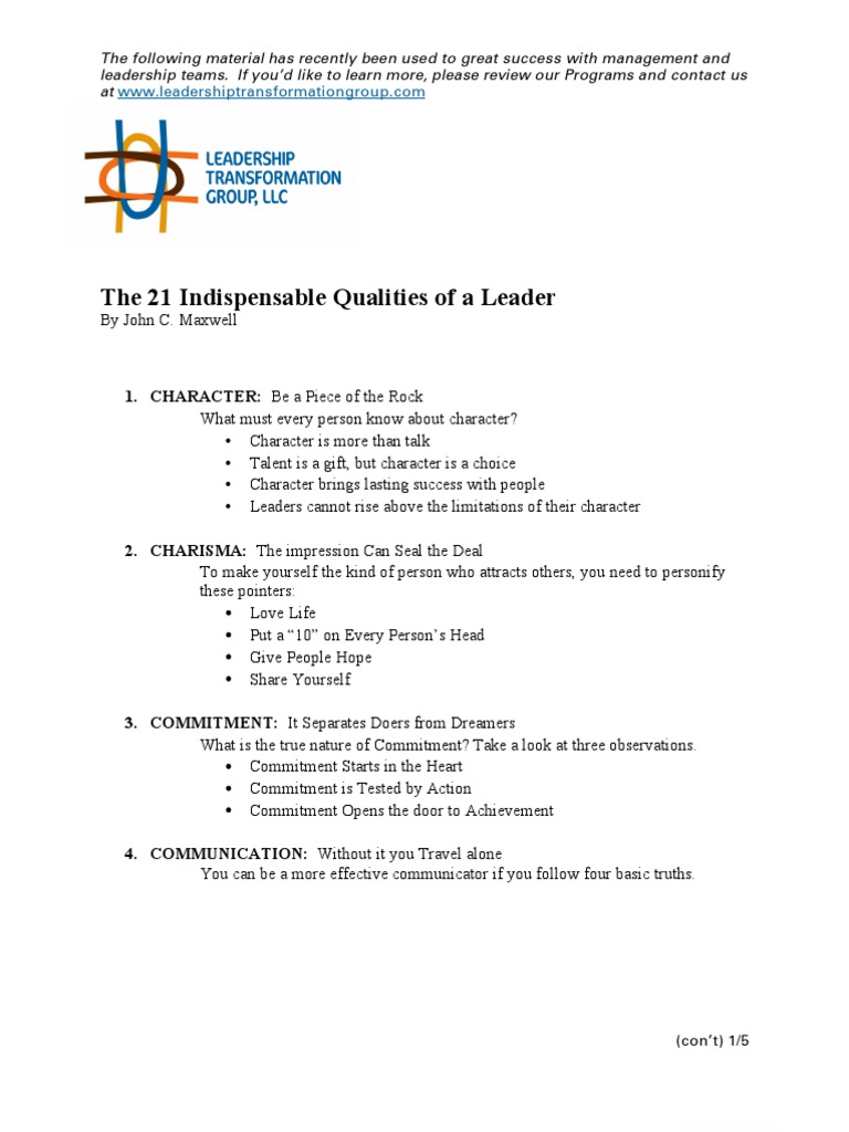 21 Indispensable Qualities Of A Leader Maxwell John C Maxwell 21 Leadership Qualities