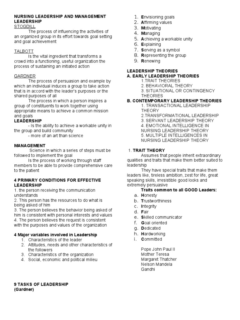 Nursing Leadership Theories Temple Beth El Leadership And Management Theories In Nursing