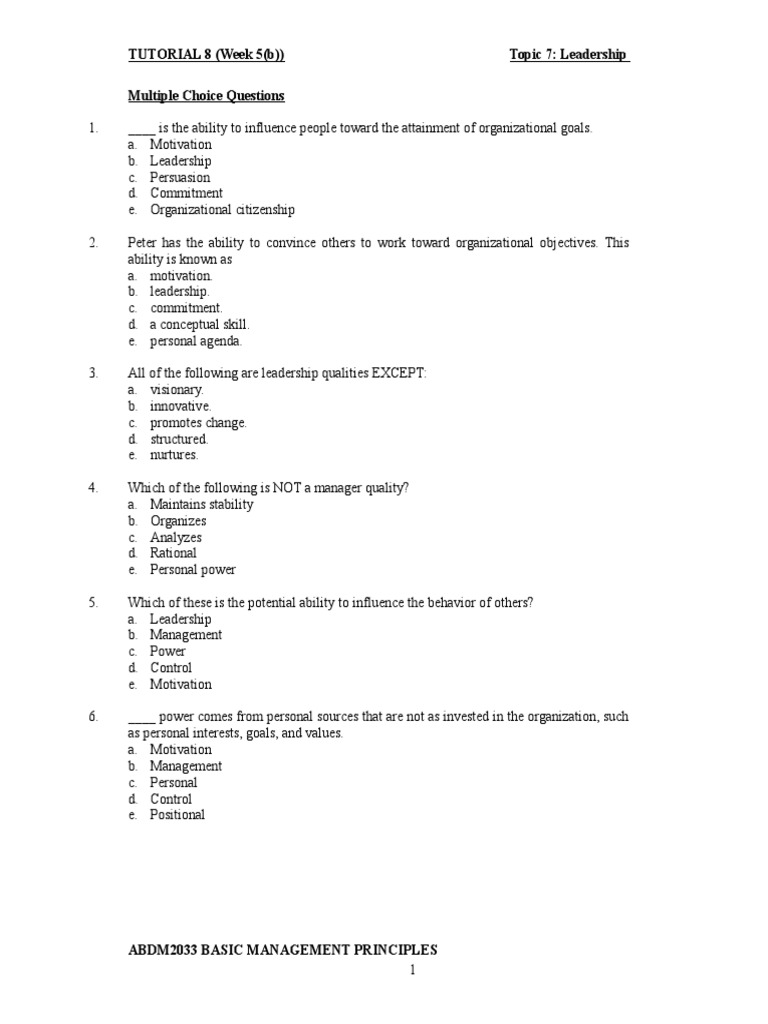 Management Principles Tutorials Questions Leadership Leadership Mentoring Leadership Questions Multiple Choice