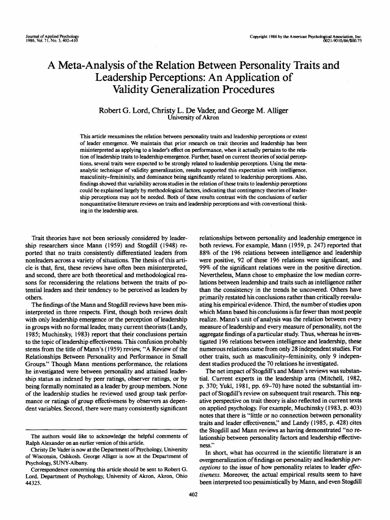 R G Lord C L De Vader G M Alliger 1986 Meta Analysis Leadership Traits Journal Articles